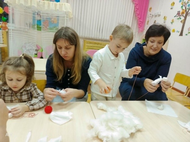 Разделение на группы по семьям. Демонстрация техники сборки куклы, пошаговые инструкции по созданию изделия каждым участником. Родителям рекомендуется помогать детям бережно, направлять их работу, подсказывать идеи для декора.