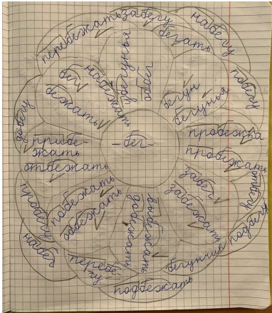 Дети вписывают корень в середину цветка. За определенное время на уроке, а потом и дома стараются собрать как можно больше однокоренных слов и записать их на лепестках. Разрешается использовать словари, интернет-ресурсы, можно и нужно обращаться за помощью к взрослым (см. фото 3 и 4).